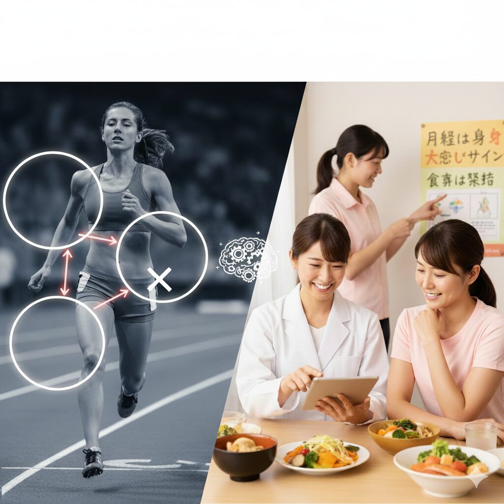 これは ①利用可能エネルギー不足、②運動性無月経、③骨粗鬆症 の3つが互いに影響し合う深刻な症候群で、競技パフォーマンスだけでなく長期的な健康に大きな影響を及ぼします。